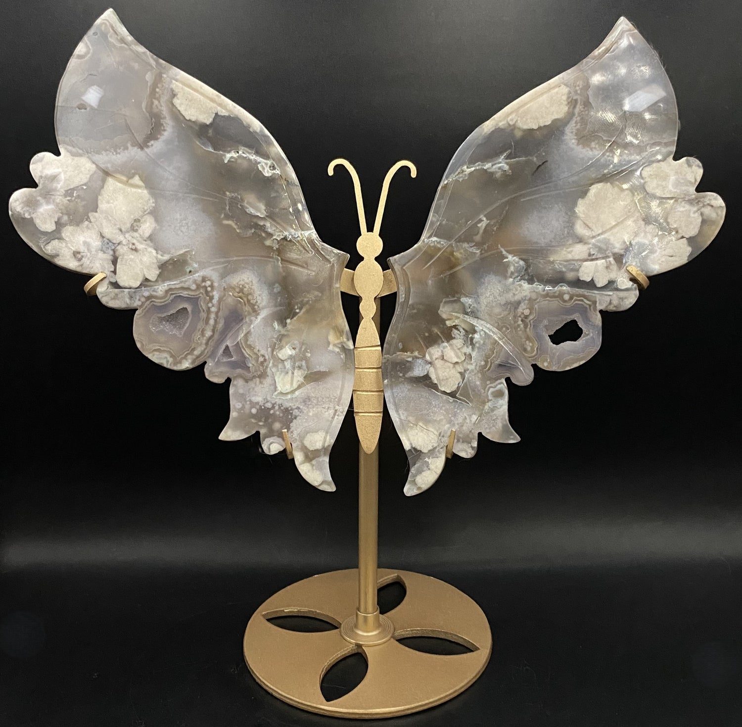 • Set decorativ din agat negru, obsidian si apofilit pe fundal negru